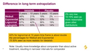 Using prior distributions for the survival probability at certain time points, the parameters of standard distributions like exponential, Weibull, Gompertz, Generalized Gamma, lognormal, loglogistic and extensions with spline and cure models were estimated for Keynote 24. Different assumptions were formulated into prior distributions related to the hazard ratio at 5 years and 10 years, given that the ratio between hazards stayed the same, that it declined, and that there was no treatment effect remaining.