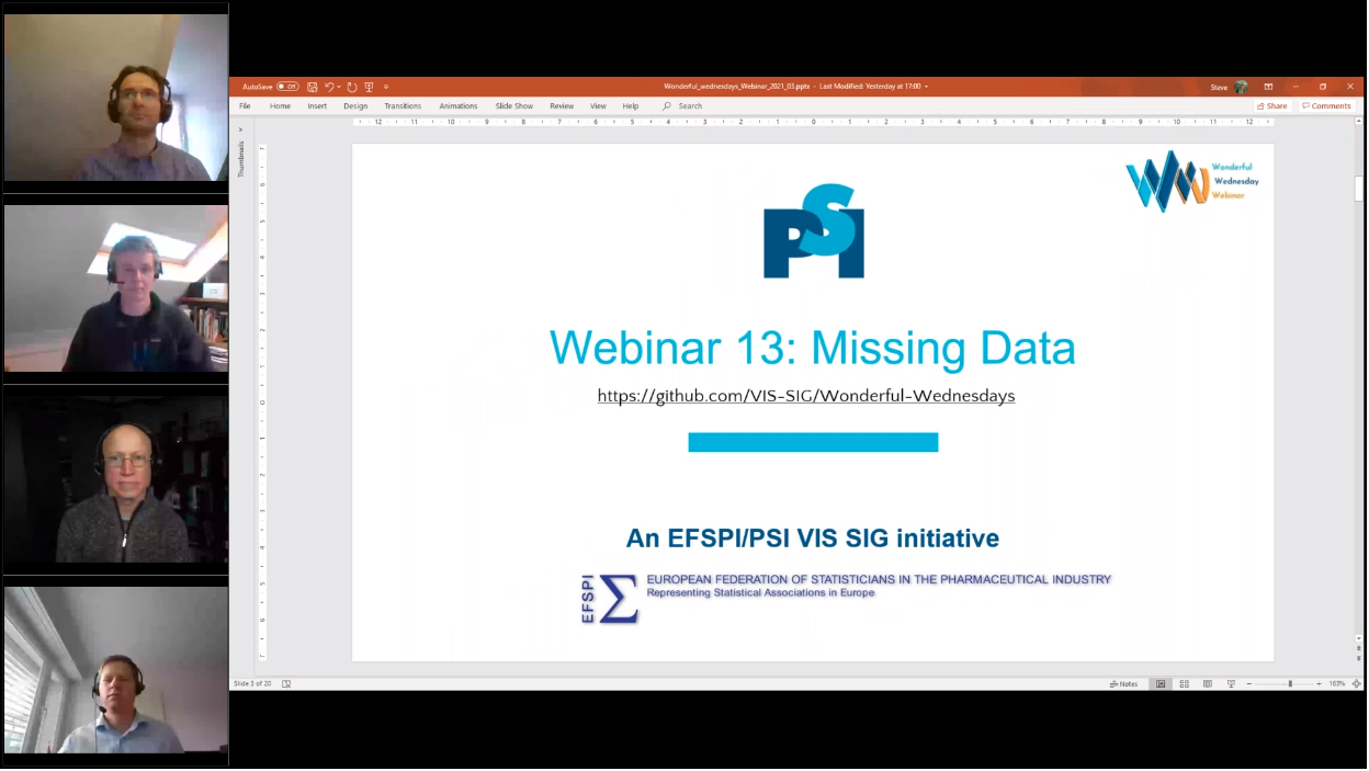 Steve Mallet leads the discussion on ways to display data that is actually missing. The example data was based on a study with multiple measurements of pain that were partially incomplete. The presented visualisations can help to describe the amount, the nature and the impact of missing data on the study outcome. The mirrored histogram highlighted the difference in missing data in specific subgroups. In the Sankey diagram it is possible to see the missing data linked to the actual outcome pain. The course of pain over time is nicely shown in an animated scatter plot. For exploration of the complete data a complex lasagna plot surrounded with additional graphs gives insight. And a powerful tool to actually guide the reader though the data is scrolly-telling. All visualisation are available on the Wonderful Wednesday blog.